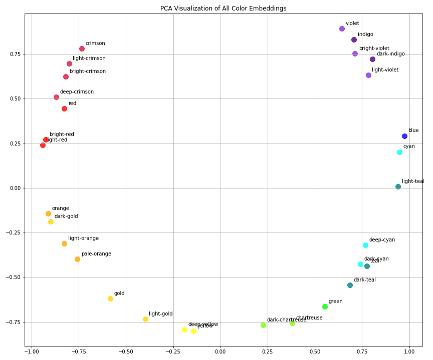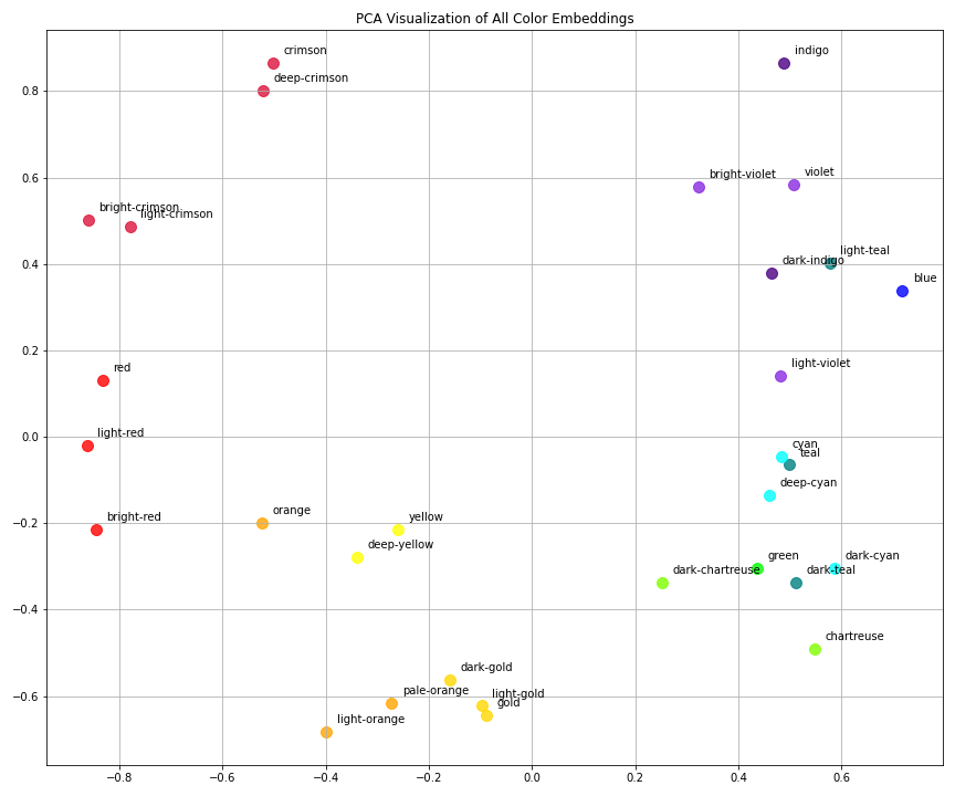 - Semantically related colors (like different shades of red or yellow) are clustered together.